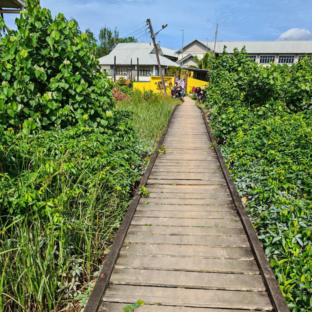 Reaching SK Muhibbah presented two challenging routes: a precarious sampan crossing with our delicate equipment, or a longer land route through muddy trails and unexpected construction. Upon arrival, we found the school's entrance under renovation.